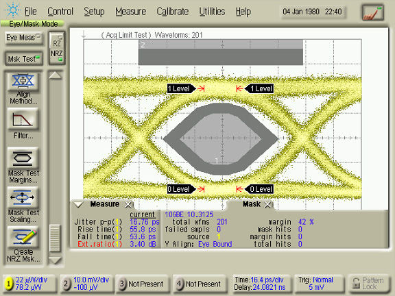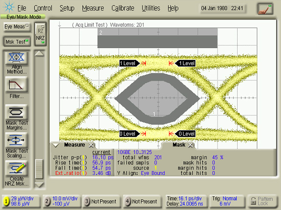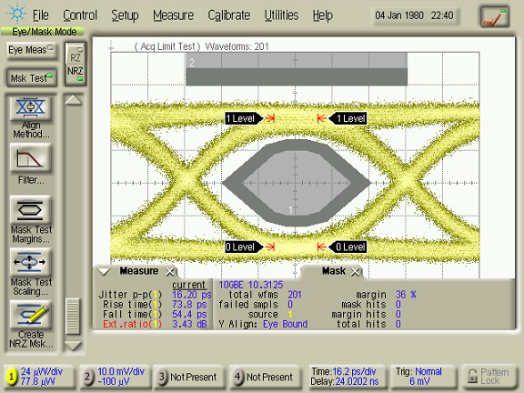 The sample module enclosure was tested at 45°C optical eye diagram with the following eye diagram template and parameters: